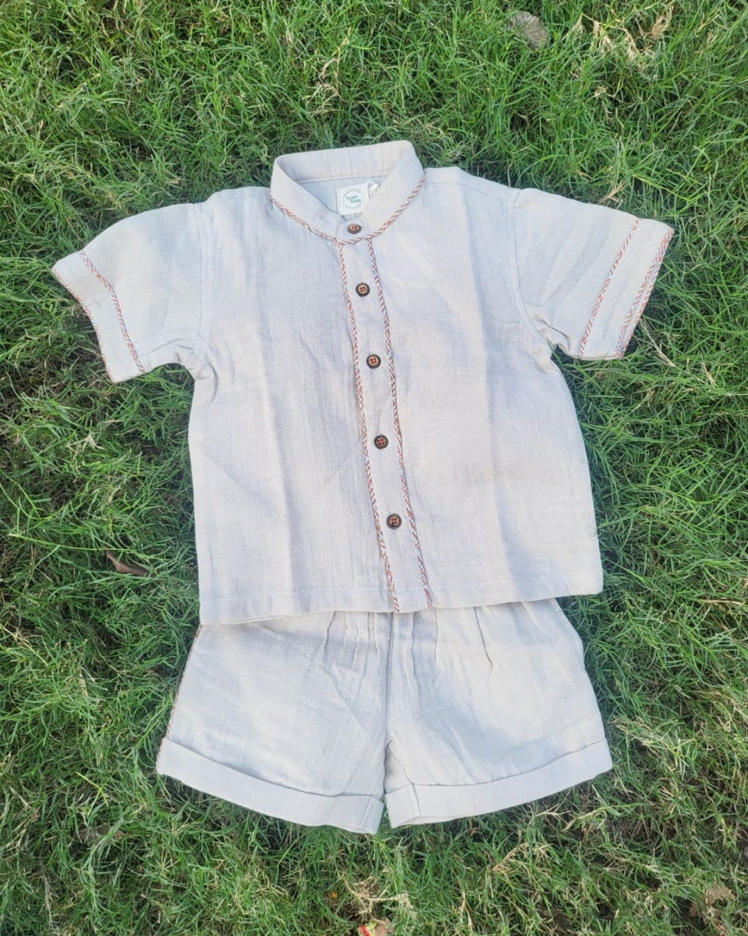 This elegant co-ord set is crafted from soft, breathable muslin, making it perfect for warm days and festive moments alike. The classic short-sleeve shirt features delicate contrast stitch detailing and wooden buttons, paired with relaxed-fit shorts for all-day comfort. Light, airy, and timeless, this set is ideal for celebrations, holidays, and everyday dressing with effortless charm.