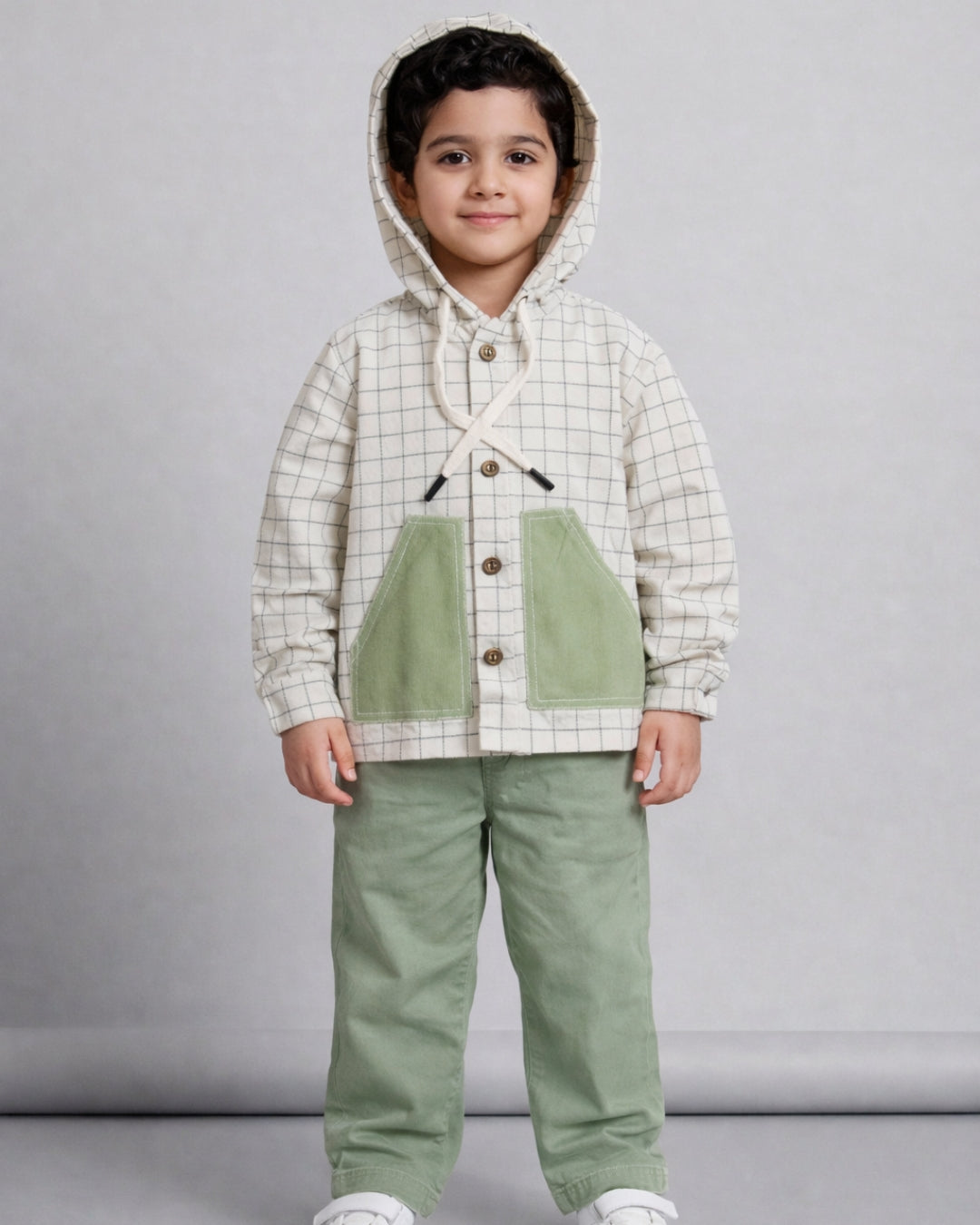 Keep your little adventurers cozy and fashionable with our checkered hoodie shirt! It boasts fun patch pockets and a snug hood, making it ideal for days filled with excitement and limitless exploration.