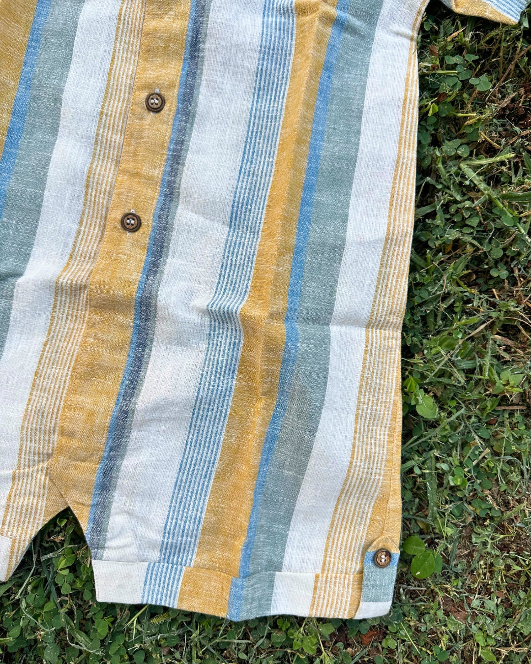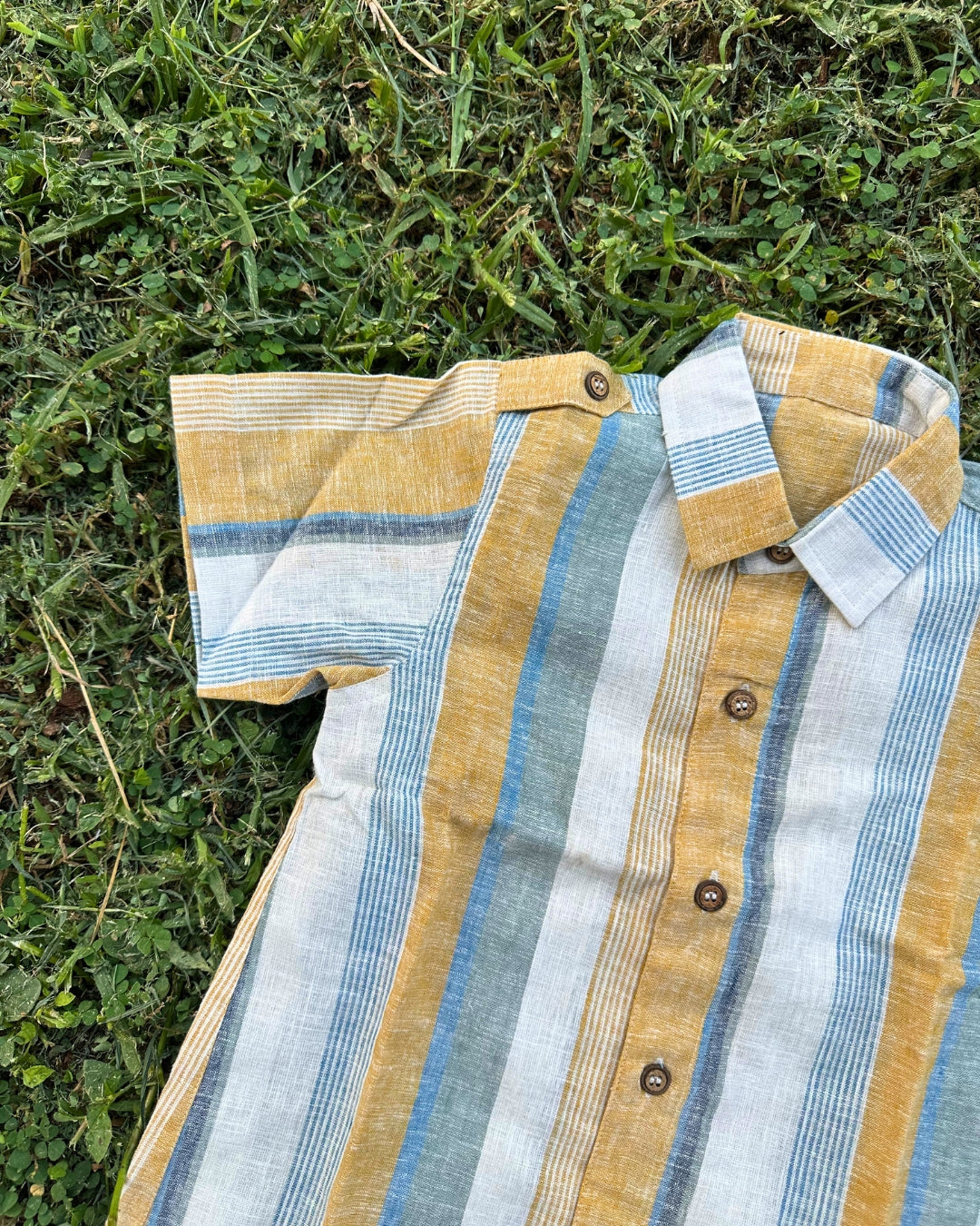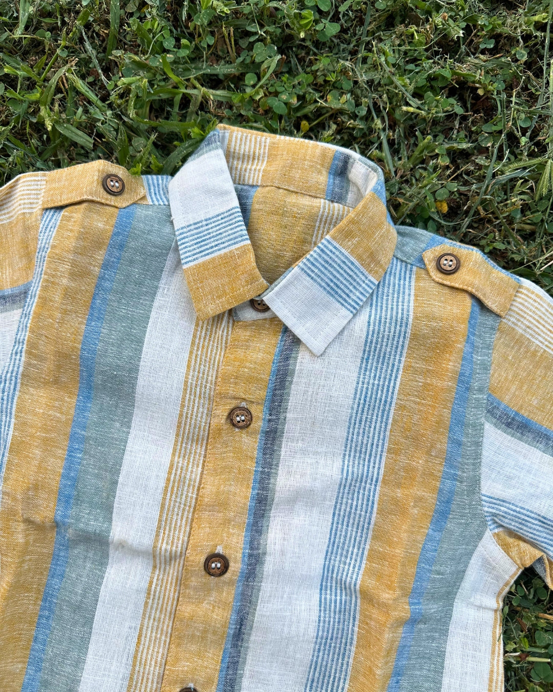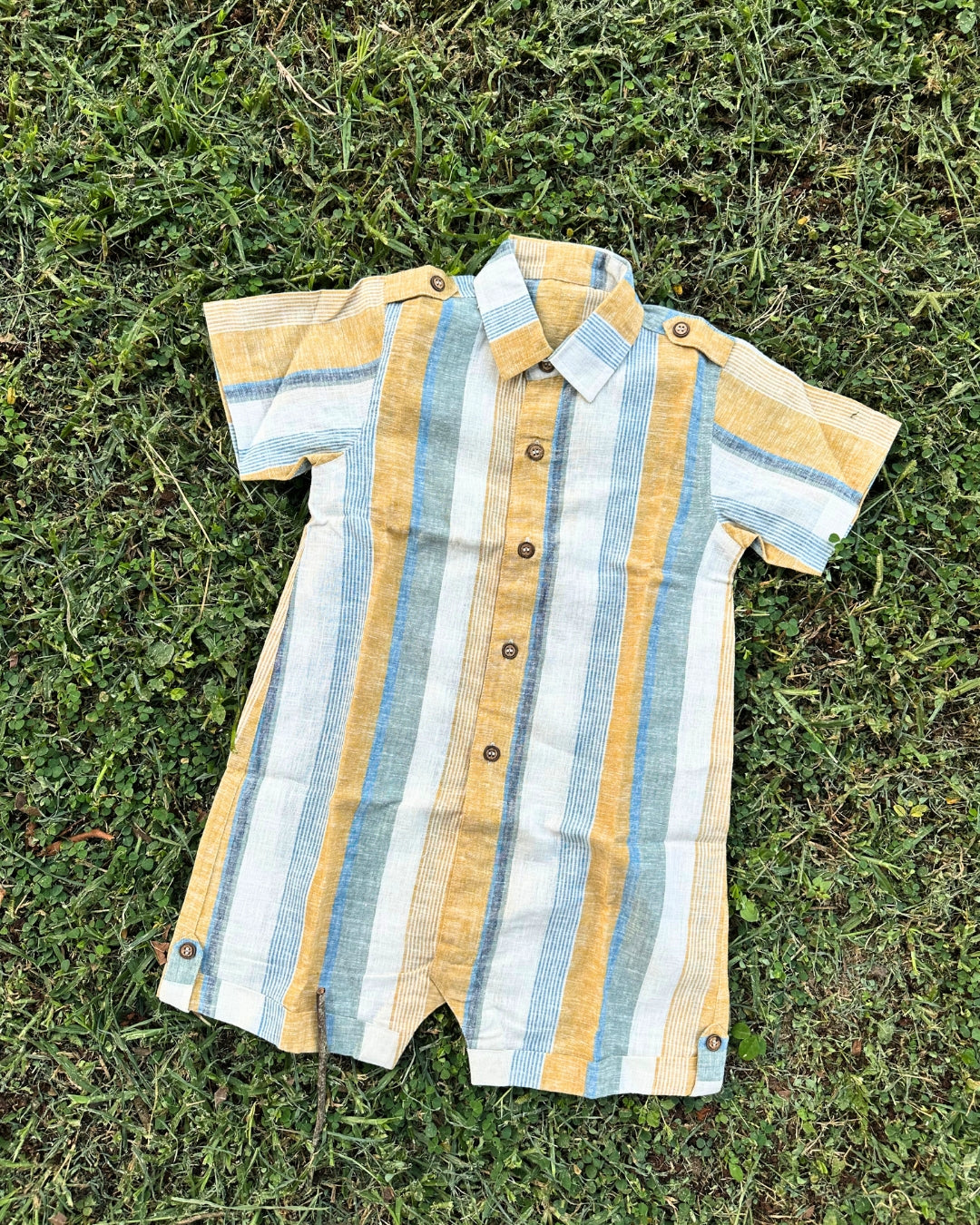 Inspired by soft sunlit days, this striped playsuit romper is crafted in lightweight linen-cotton for all-day comfort. Featuring classic wooden buttons and smart detailing on the shoulders and hem, it blends a timeless look with breezy ease. Perfect for sunny adventures and little explorers on the go!