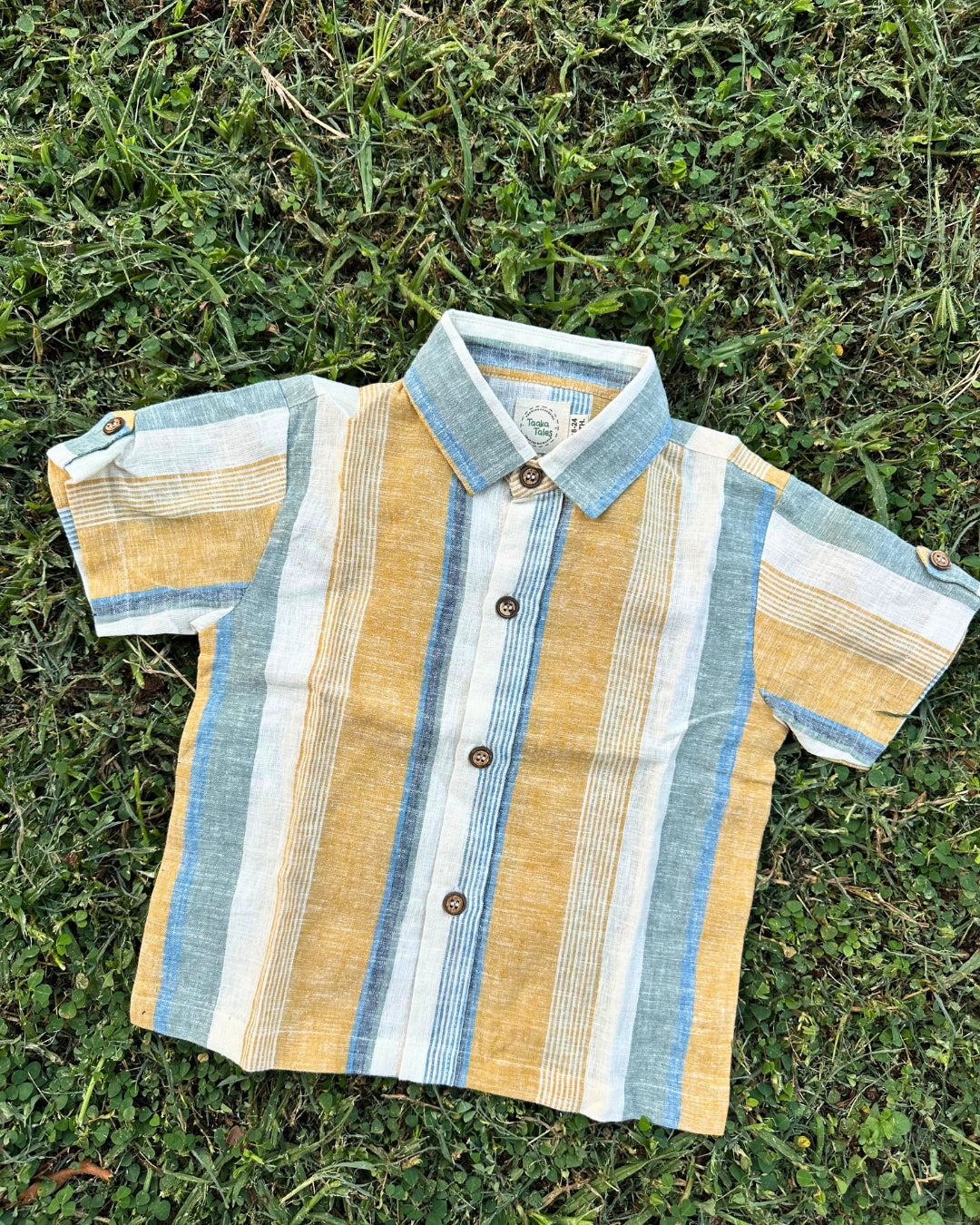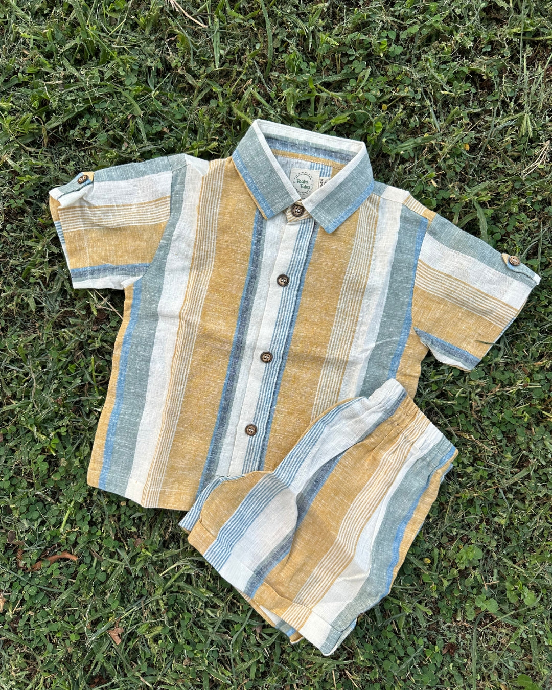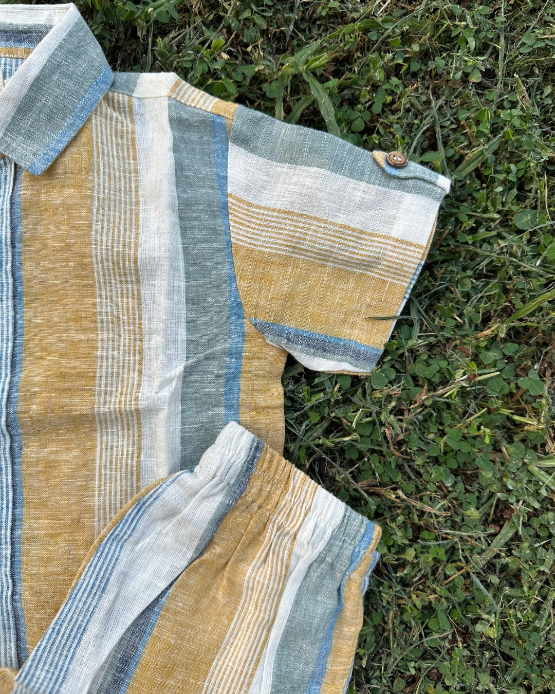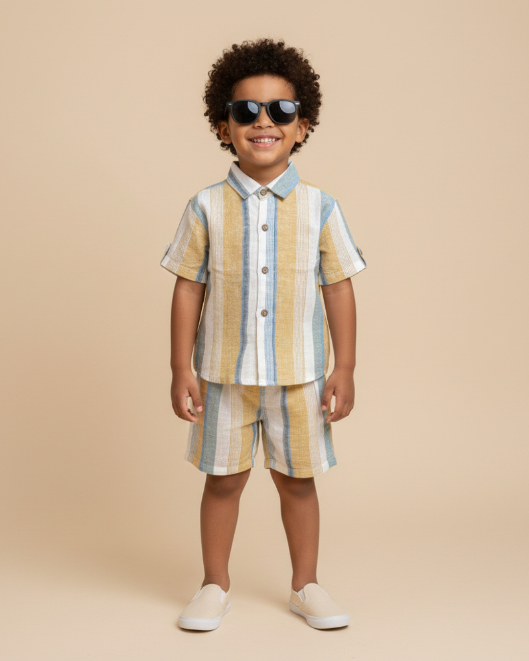 This breezy co-ord set is crafted in soft, breathable cotton-linen, making it perfect for sunny days and playful outings. The shirt features classic stripes in earthy tones with wooden button detailing, giving it a timeless charm. Paired with matching shorts for an effortlessly coordinated look
